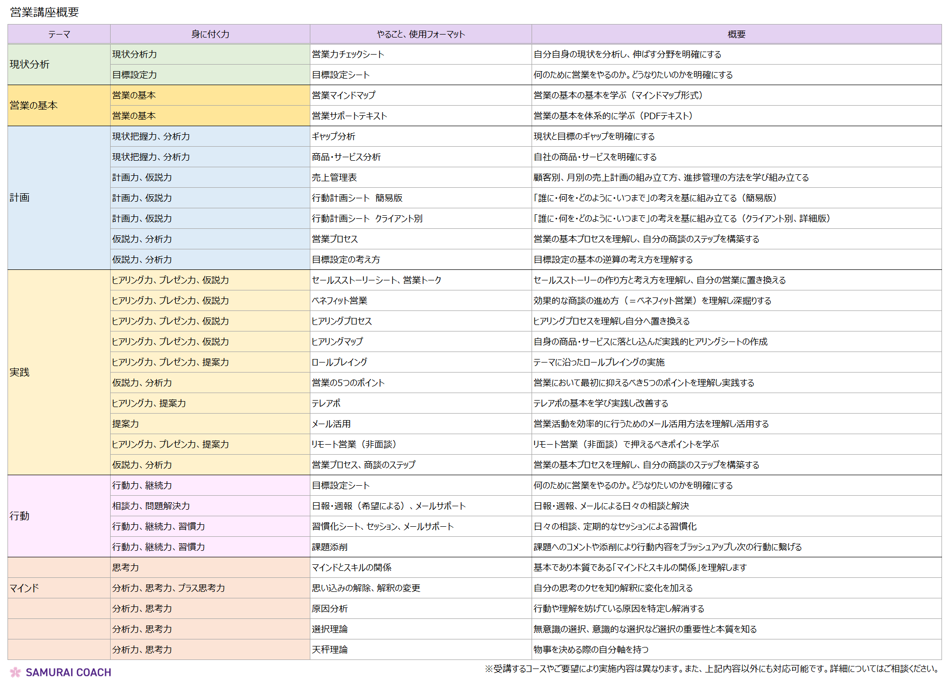 具体的に何をやるのか、何を提供できるのか。私が提供できることを上記【営業講座概要】にまとめましたのでご参考ください。